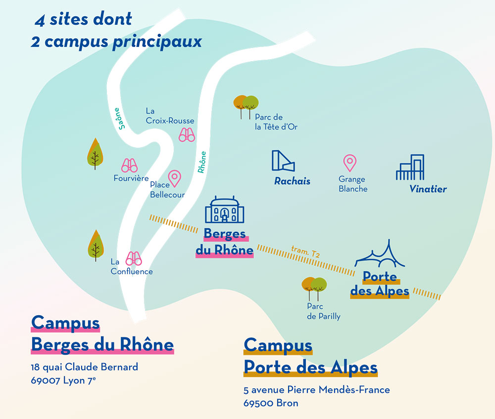 Université Lumière Lyon 2 has two campuses in Lyon, Berges du Rhône and Porte des Alpes, and two satellite sites. They are home to 27,000 students, offering them a stimulating study and work environment, tailored to the needs of the community.